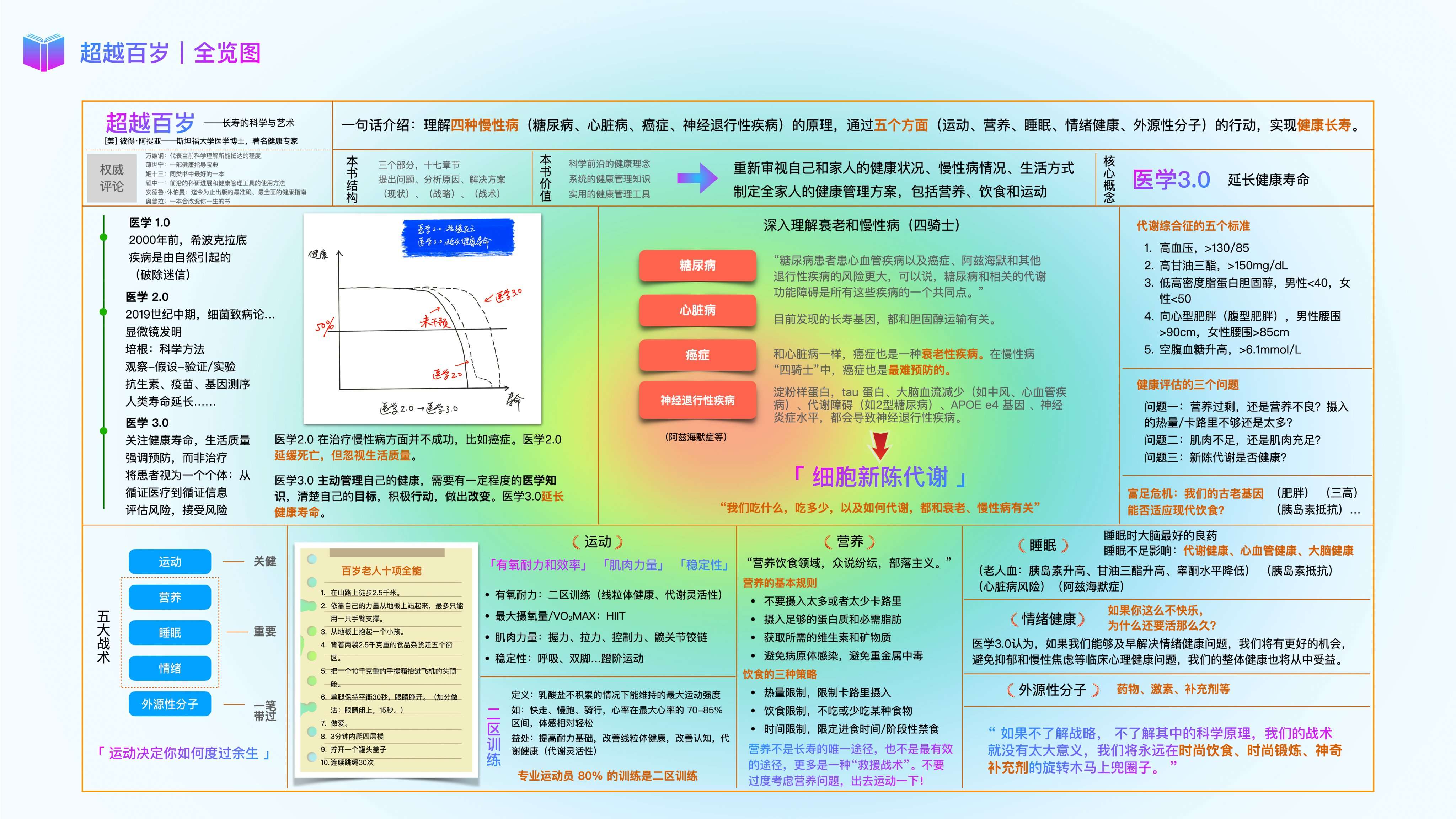 从孟岩的播客中被推荐的这本书,是一本非常好的现代医学养生书。虽然标题看着像是长寿,但实际作者更希望读者关注的是整个生命历程中的生活质量,即没有慢性病的长寿。为了达到这个目标, 作者提倡早做准备,用良好的生活习惯来预防,而不是等病了再去治。 借用网友总结的这张图