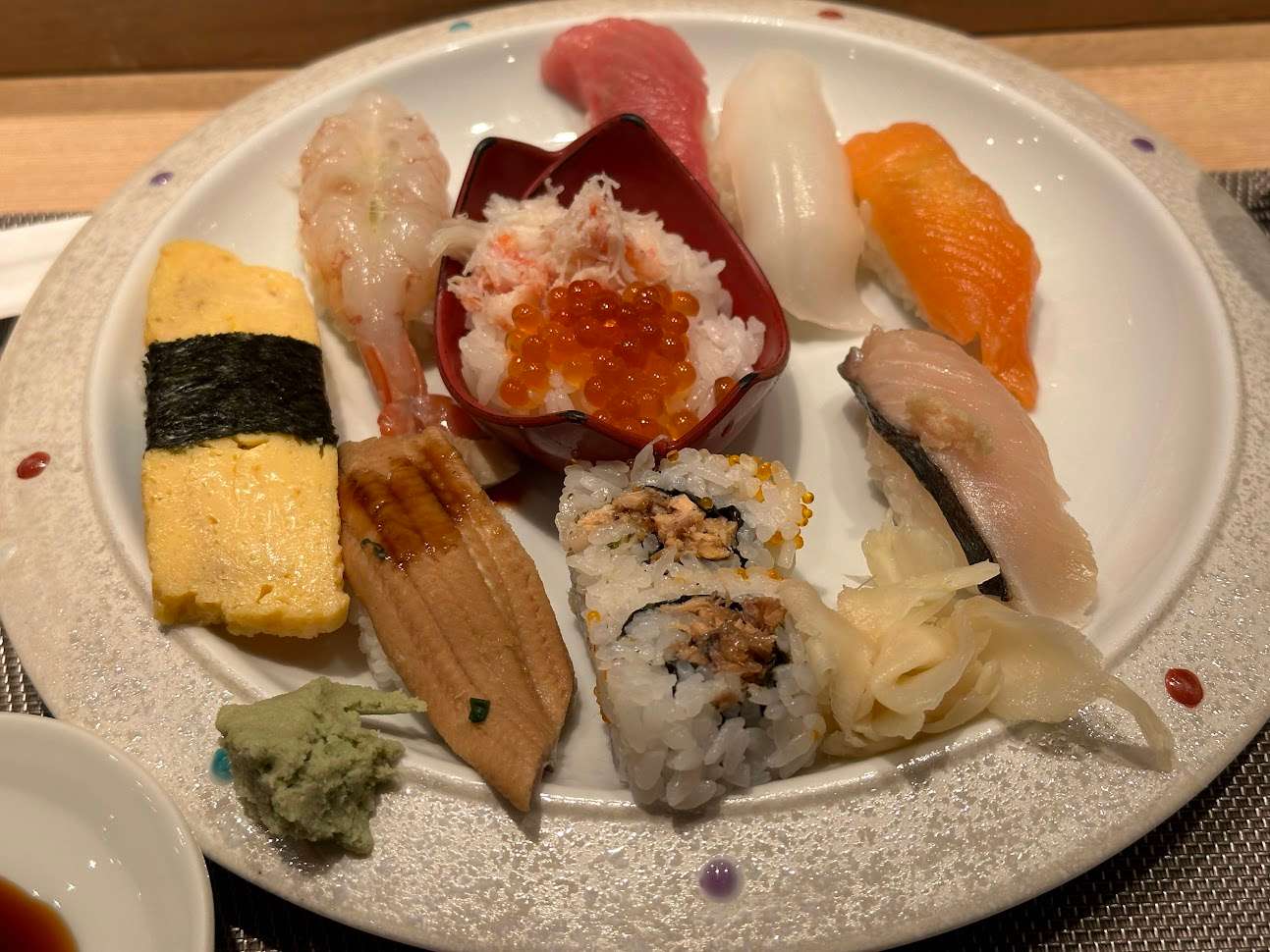 - 坐在吧台看师傅现场捏,午市套餐不到 100RMB,包含十多个寿司、迷你碗的蟹肉鲑鱼子饭、味增汤、茶碗蒸,味道不错。